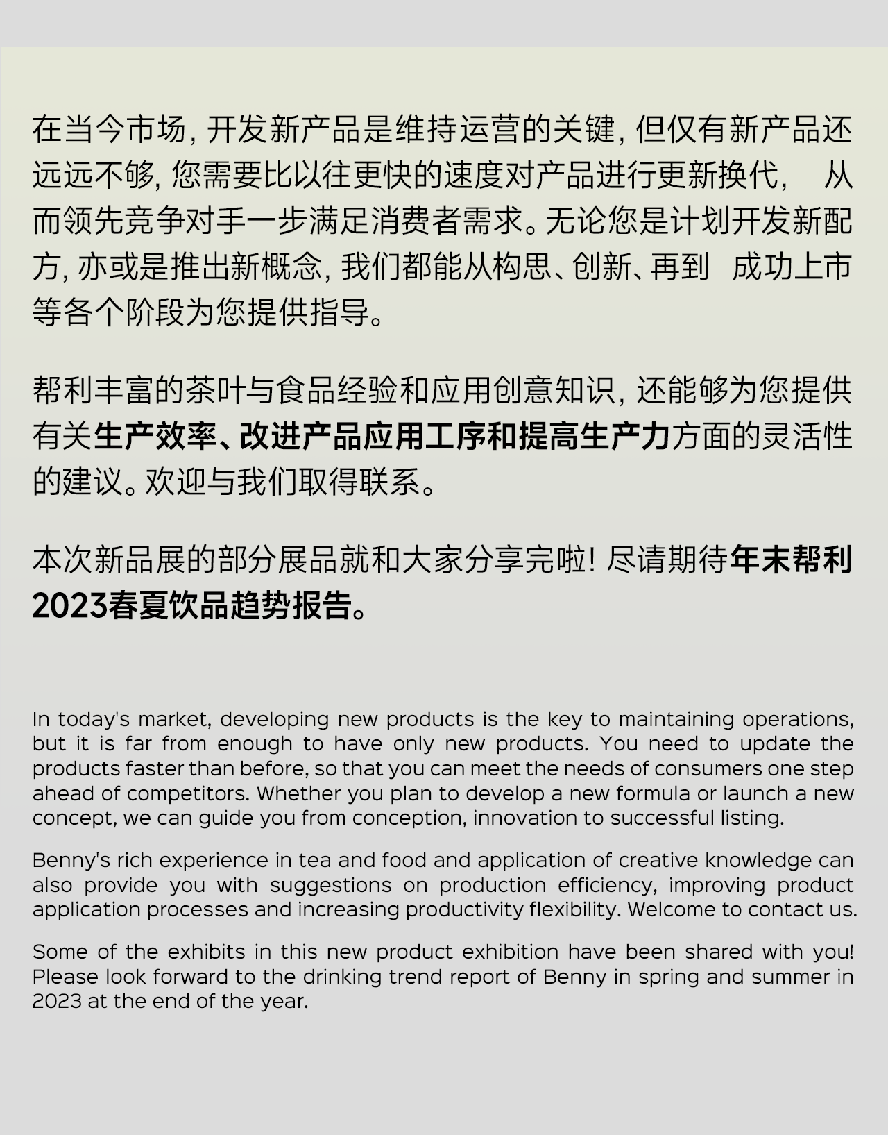 作為一家專業(yè)的餐飲用茶與解決方案服務(wù)機(jī)構(gòu),各類型的精制茶葉是幫利的產(chǎn)品核心。 這些茶葉產(chǎn)品包括中國傳統(tǒng)六大茶類及世界主要茶葉產(chǎn)區(qū)的茶葉,通過幫利專業(yè)技術(shù)人員的拼配與調(diào)配,這些茶葉產(chǎn)品被制作成包括餐飲用茶、袋泡茶、花果茶、三角茶包、功夫茶等相關(guān)產(chǎn)品面向連鎖茶飲、咖啡、中餐、西式快餐、火鍋,以及各類型含茶瓶裝飲料,出現(xiàn)在各類型生活場景中...